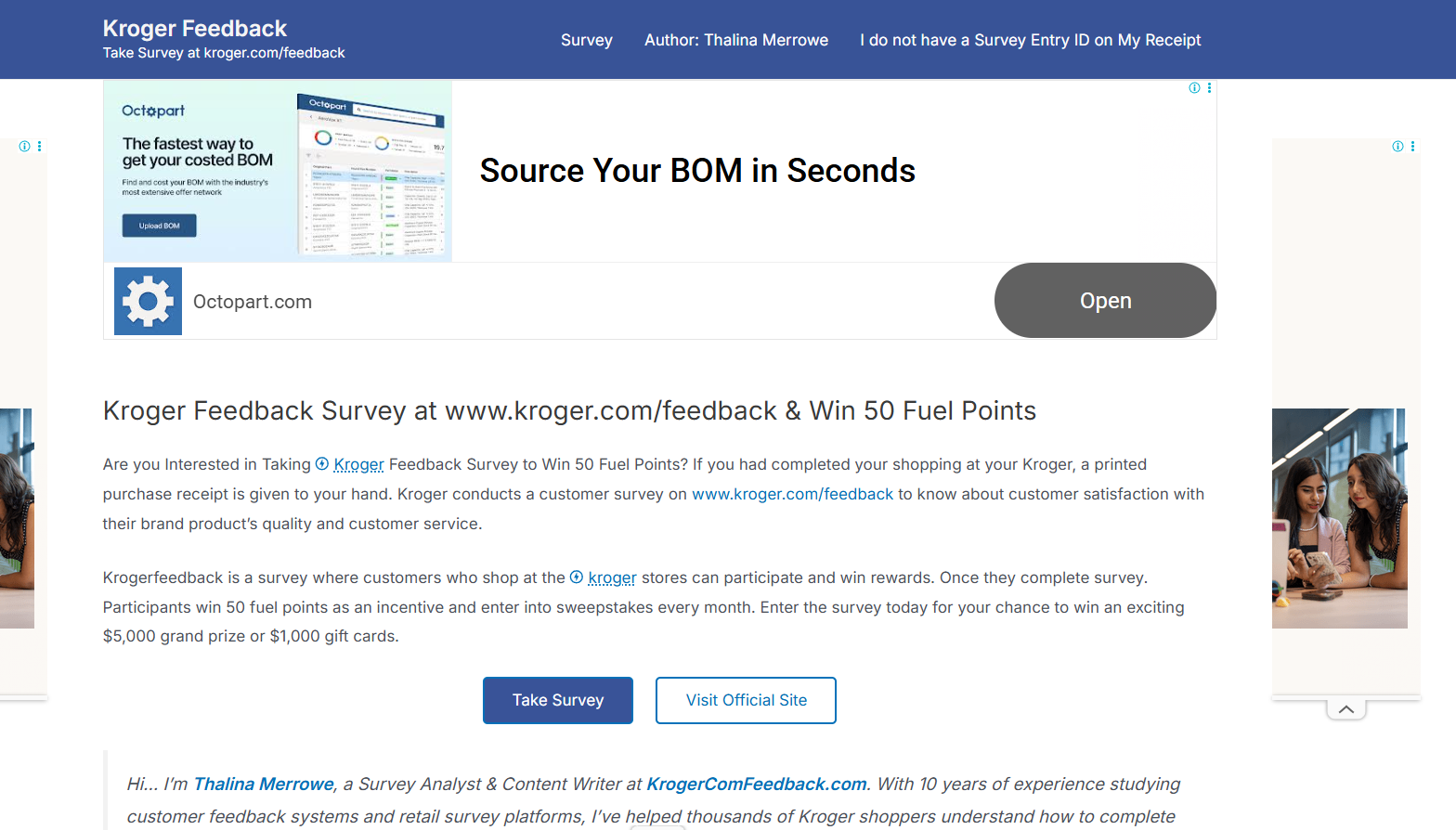 I’m Thalina Merrowe, a Survey Analyst & Content Writer at KrogerComFeedback.com. I bring over 10 years of experience studying customer feedback systems and retail survey platforms — helping thousands of shoppers understand how to complete the Kroger feedback survey, redeem fuel-point rewards, and troubleshoot survey issues. ✨